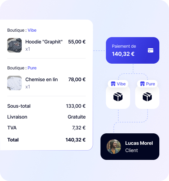 - Panier unique multi-vendeurs : votre client achète 3 produits chez 3 vendeurs différents ? Il ne fait qu’un seul paiement. Origami Marketplace s’occupe de découper la somme en arrière-plan.